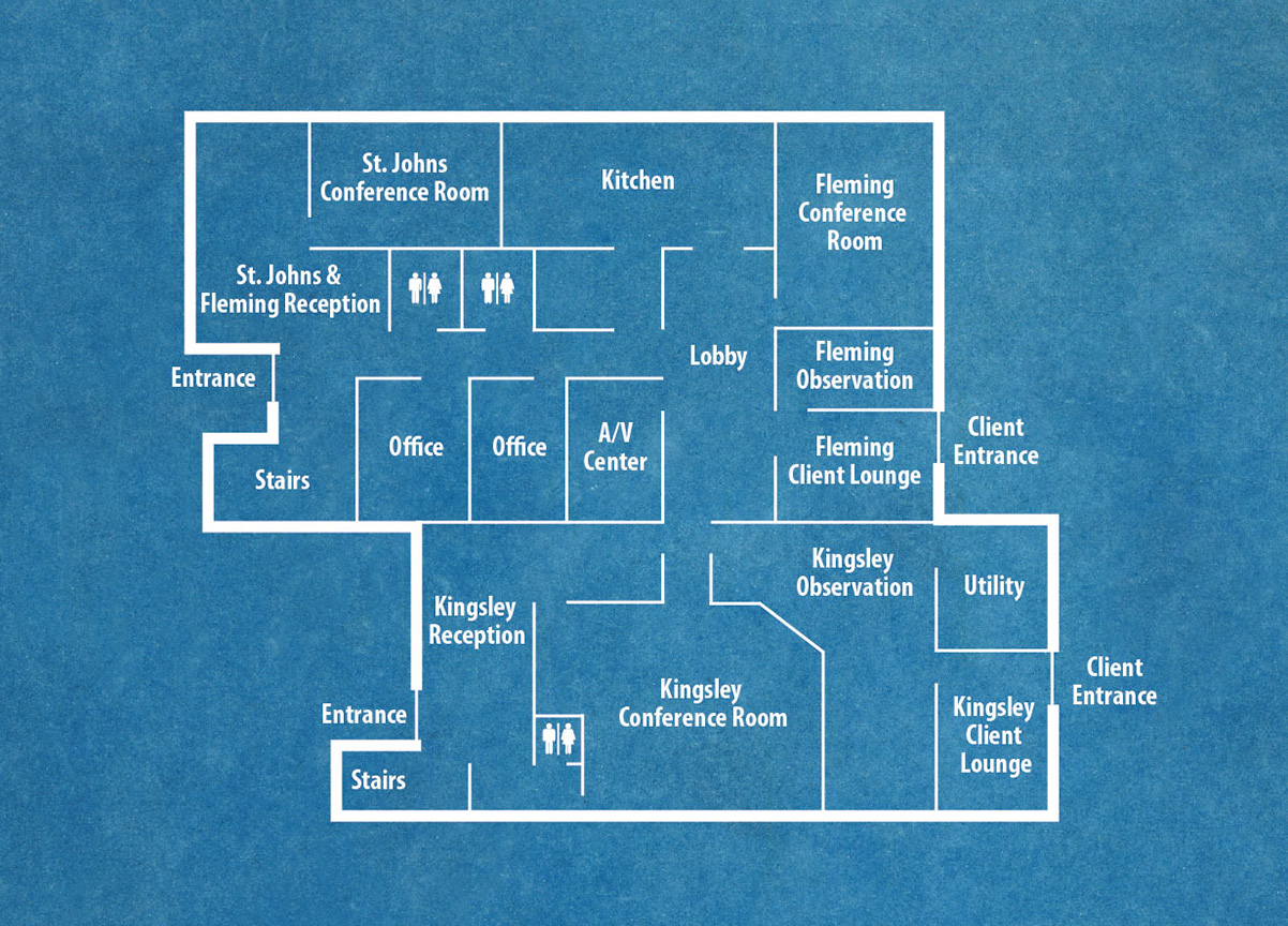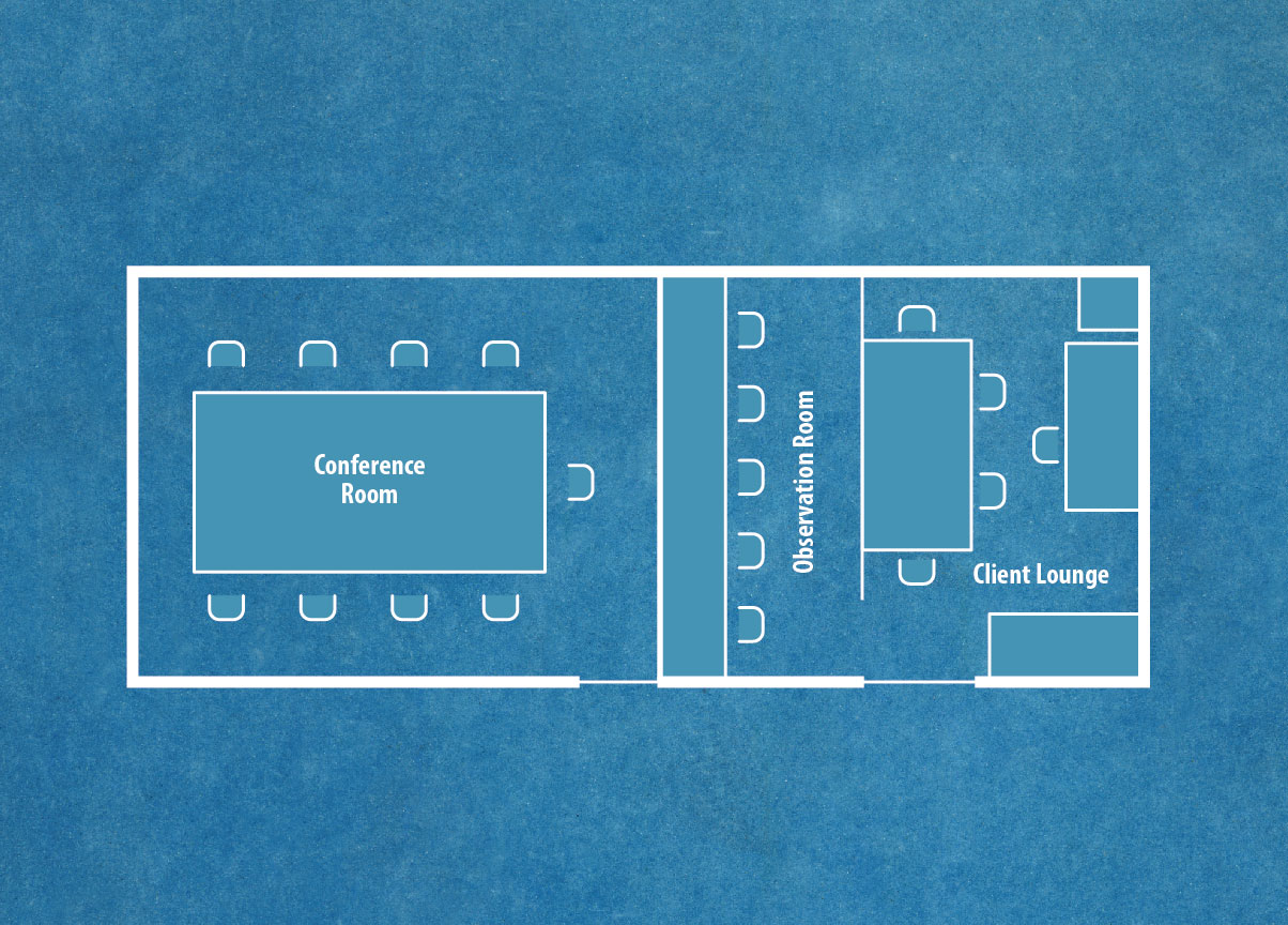 We have two focus group suites (Kingsley and Fleming) with an additional conference room which can also be utilized for breakout sessions (St. Johns). Each suite is made up of a Focus Group Room, Observation Room, and a Client Lounge.
